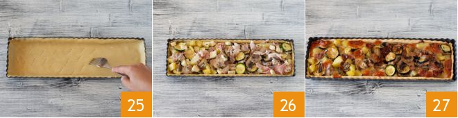 Prick the bottom with a fork 25 and fill with the previously prepared filling, distributing it evenly 26. Bake in a preheated static oven at 350°F for 35 minutes. When cooking is complete, take out the rustic pie with potatoes, mushrooms, and scamorza and enjoy it after it has cooled slightly.
