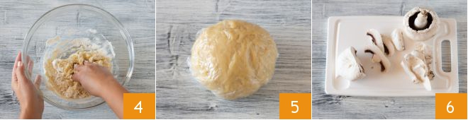 Work the dough by hand 4 until you get a well-compact dough ball. Cover with plastic wrap and let it rest for an hour 5. In the meantime, prepare the filling: clean the mushrooms and slice them 6.