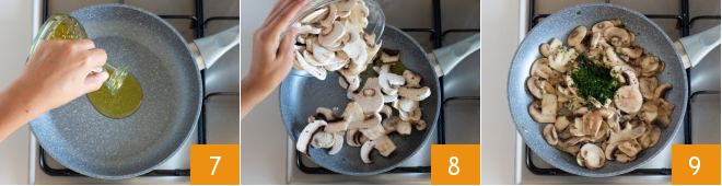 Heat a drizzle of oil in a pan 7, add the mushrooms 9, sauté them for a couple of minutes, then add the parsley 9 and cook them for 6-7 minutes.
