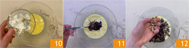 Beat the eggs and add the gorgonzola in pieces 10, also add the radicchio 11, salt, pepper, and the walnuts crumbled by hand 12.