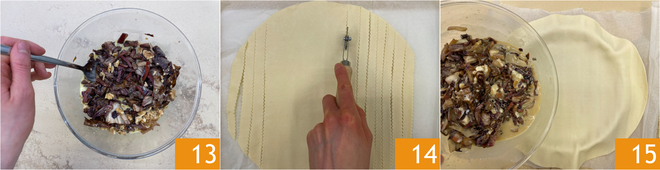 Lift the horizontal strips that you haven't lifted before and place a strip vertically. Continue this way until you complete the strips and create a lattice 19. Fold the edges inward and brush with an egg yolk 20. Bake the savory radicchio and gorgonzola tart in a preheated static oven at 350°F for about 35 minutes. Serve it at the table when it is warm 21.