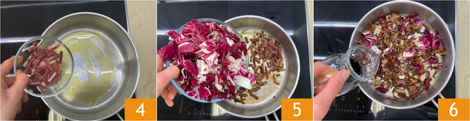 Move to the stove. In a pan with hot oil, add the speck 4 and let it brown over medium heat for a few minutes before adding the washed and drained radicchio 5. Sauté for a minute and then add the red wine, increasing the heat 6.