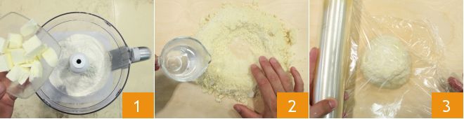 To make the savory rice puddings, start by preparing the pastry. Follow our recipe Easy Shortcrust Pastry: place the flour, cold chopped butter 1, and a pinch of salt in a food processor and blend until you get a sandy and floury mixture. Place the obtained mixture on a work surface in the classic fountain shape and knead quickly, gradually adding cold water 2 until you get a compact and fairly elastic dough. Once ready, wrap your pastry in a sheet of plastic wrap 3 and let it rest in the fridge for at least 40 minutes.
