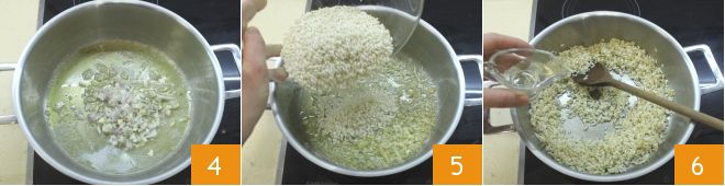 Meanwhile, prepare the risotto. In a pan, heat a drizzle of oil and add finely chopped shallots 4; let the shallots soften and then add the rice 5, allowing it to toast for a few minutes. Deglaze with white wine 6