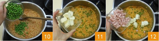 Halfway through cooking, add the peas 10. Continue cooking by incorporating the broth little by little until the rice is ready; it should be very al dente because it will continue cooking in the oven. When the rice is ready, cream with taleggio cheese 11 and also add the diced cooked ham 12.