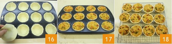 and line a greased muffin tin with these casings 16. Fill the pastry with the risotto 17 and bake in a preheated static oven at 350°F for 60 minutes. Once done, take the puddings out of the oven and let them cool slightly, then remove them by turning the mold onto a tray or removing them one by one from the mold. Your savory rice puddings are ready to be enjoyed 18.