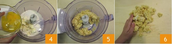 and the egg 4. Close with the lid and start the processor until you get a crumbly mixture 5. Transfer the mixture to a pastry board and quickly work it with your hands 6
