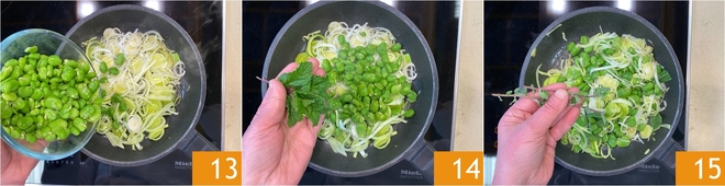 Let it soften for a few minutes, then add the 11 oz of broad beans 13, the mint leaves 14 and the marjoram 15.