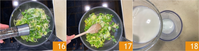 Season with salt and pepper 16, then cook over medium heat for 5 minutes 17. In the meantime pour the milk and cream into a tall container 18.
