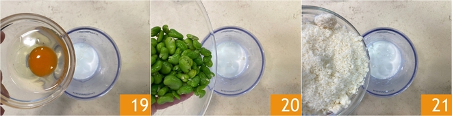 Add the egg 19, the 4 oz of broad beans 20 and the grated pecorino 21.