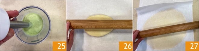 You should obtain a smooth cream 25. At this point take the pâte brisée out, place it on a floured surface and begin to roll it out 26 to a thickness of about 1/16–1/8 in (2–3 mm) 27; if you prefer you can roll it between two sheets of parchment paper, so you won't need any additional flour to prevent it from sticking to the work surface.