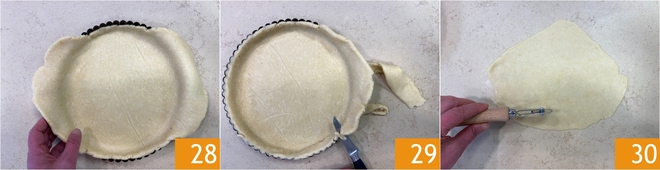 Transfer the pastry disk into a tart pan 9.5 in in diameter 28 and use your hands to press it well into the edges. Using a sharp knife trim the excess pastry 29 and rework it. Roll out the remaining dough to cut strips about 3/4 in (2 cm) wide with a fluted pastry wheel 30.