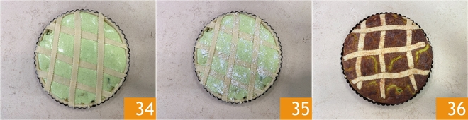 Arrange them first in one direction and then the other to create a diamond pattern 34. Finally sprinkle the remaining pecorino over the surface of the tart 35. Bake in a preheated conventional oven at 356°F on the middle rack for 60 minutes. Remove from the oven and let the savory tart with broad beans and pecorino cool before serving 36!