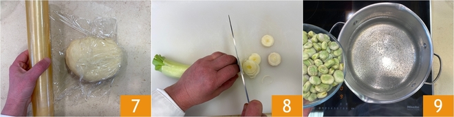 Transfer the dough to the work surface, work it a few more moments and wrap it in plastic wrap 7. Leave at room temperature until ready to use. Move on to the filling: trim the leek and slice it into rounds 8. Boil the shelled broad beans in boiling water for 5 minutes 9.