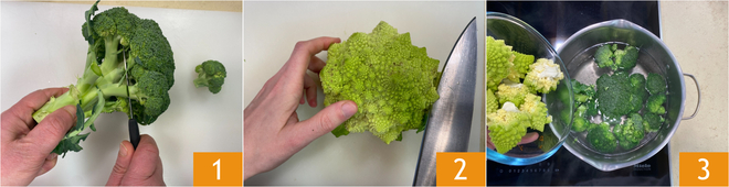 To prepare the savory tart with broccoli, first clean and separate the florets from both the common green broccoli 1 and the Romanesco 2; you should obtain about 1.1 lb (500 g) of cleaned broccoli. Cook the florets in salted boiling water for 15 minutes 3.