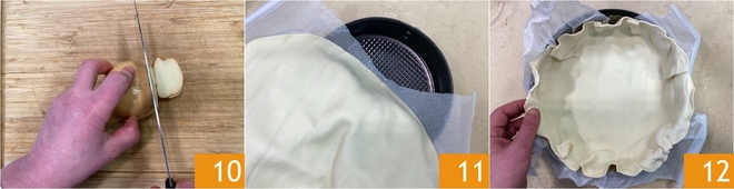Slice the scamorza thinly 10. You're ready to assemble the tart: unroll the round puff pastry and lay it into a 9-inch (22 cm) pan lined with parchment paper 11. Try to press the pastry snugly against the edges of the pan 12.