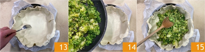 Prick the base of the pastry 13, then fill with the cooked broccoli 14 and level with a spoon 15.