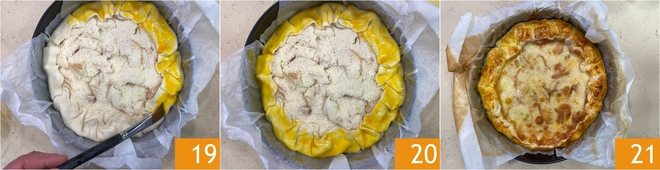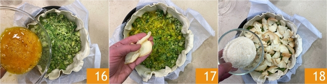 Also pour in the beaten eggs 16, then arrange the slices of scamorza on the surface 17 and sprinkle with grated Parmigiano Reggiano 18.