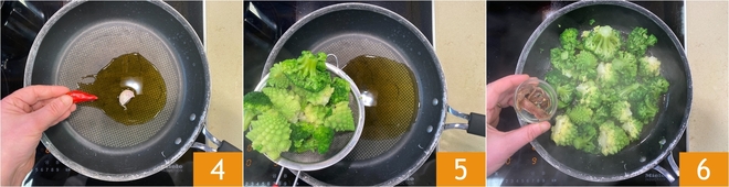 Heat a nonstick pan with a drizzle of oil, a clove of garlic and a fresh chili pepper 4. After the 15 minutes of cooking, drain and transfer the broccoli to the pan 5. Add the anchovies 6 and cook for about 6–7 minutes.