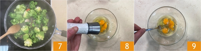 Mix well; the broccoli should break down 7. In a bowl, pour the eggs and season with salt and pepper 8, then beat them with a fork 9.