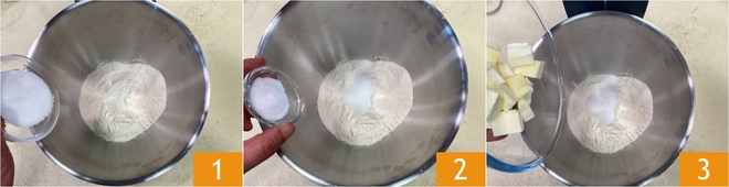 To prepare the savory tart with ham, smoked cheese, and potatoes, start with the savory shortcrust pastry: pour the flour, sugar 1, salt 2, and diced butter 3 into the bowl of a stand mixer. Mix with the paddle attachment until the mixture is well "sandy," meaning crumbly and dry.