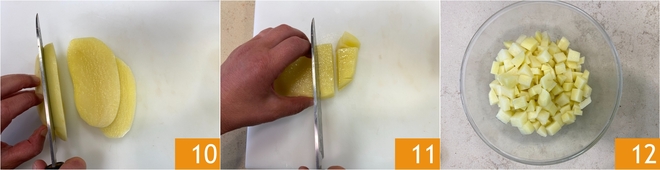 In the meantime, peel the potatoes, slice them 10, and then cut them into regular cubes 11 12.