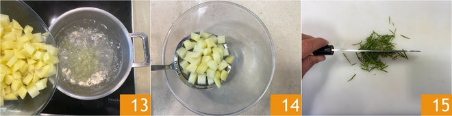 Boil the potatoes in boiling water for 7-8 minutes 13, then drain them into a bowl 14 and leave to cool. Chop the rosemary 15.