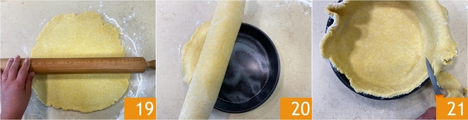 After the resting time, roll out the shortcrust with a rolling pin 19 and place it in a well-buttered and floured tart pan of 9.5 inches in diameter 20. Trim the excess dough from the edges with a knife 21.