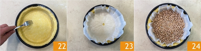 Prick the bottom and sides with a fork 22 and refrigerate again for 10-15 minutes. Take the shortcrust base and cover it with parchment paper 23, then add baking weights (such as dried legumes or ceramic balls) 34 and bake in a preheated static oven at 356°F for 20 minutes.