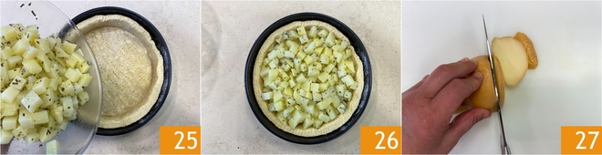 Remove from the oven and take out the weights and parchment paper, then fill the base with the potatoes 25 and bake again for another 20 minutes 26. Then, turn on the grill and let it bake for 5 minutes to brown the surface. Meanwhile, slice the smoked cheese 27.