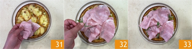 Finally, garnish with slices of cooked ham 31 and rosemary sprigs 32. Enjoy your savory tart with ham, smoked cheese, and potatoes right away 33!