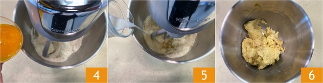Then add the egg yolks 4 and the milk in a thin stream 5, continuing to mix with the paddle until the dough is well compact 6.
