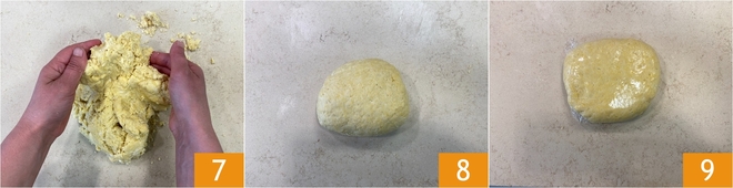 Transfer the dough to a work surface 7 and form it into a loaf 8, then wrap it in plastic wrap 9 and place it in the refrigerator for an hour.
