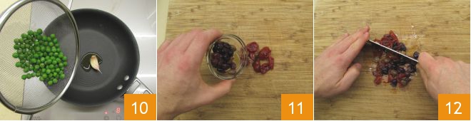 In the meantime, you can prepare the filling: heat the oil in a small pan with a clove of garlic in its skin that you have previously crushed with the palm of your hand, then add the peas 10 and a pinch of salt. Cook for 2-3 minutes on medium-high heat, then remove the garlic and let it cool. On a cutting board, place the olives and drained sun-dried tomatoes 11 and chop them finely 12.