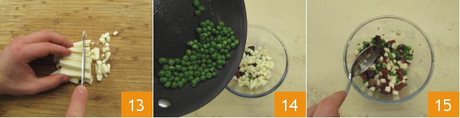 Then cut the scamorza into cubes of about half an inch 13. Transfer the chopped olives and sun-dried tomatoes into a bowl along with the cheese and peas 14 and mix everything well 15.