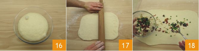 After the rising time, the dough will have doubled in volume 16, so roll it out on a lightly floured work surface to form a rectangle of 34x12 inches 17. Spread the filling evenly over the entire surface 18.