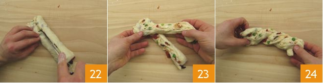 Cut it in half lengthwise with a sharp knife 22, then braid the two parts, making sure to turn the inner sides up so that the filling is visible (23-34).