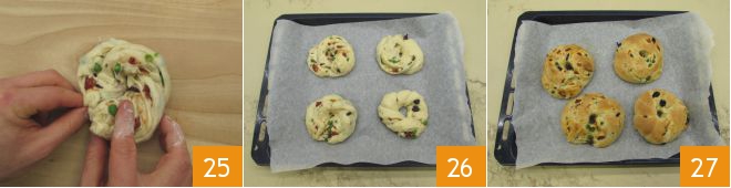 Finally, join the ends to form a donut 25. Repeat the operation for the other 3 pieces and place the obtained donuts on a baking sheet lined with parchment paper. Let them rest at room temperature for about 20 minutes 26, then bake in a preheated static oven at 356°F for about 25-30 minutes. When they're beautifully golden, your savory tasty donuts are ready to be served 27!