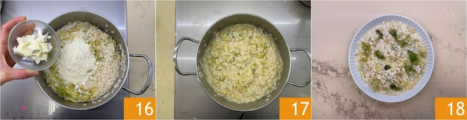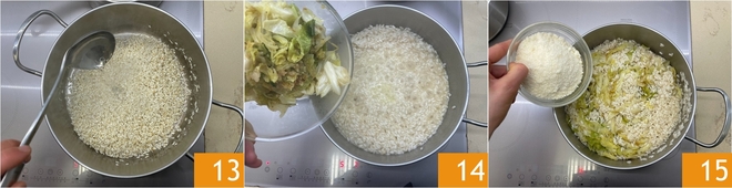 Cook the rice by gradually adding hot broth 13; it will take a total of 15 minutes. Add the savoy cabbage 14 3 minutes before the end of cooking. At the end of cooking, turn off the heat and finish with cheese