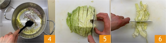 Sweat for about 7 minutes over low heat 4. Meanwhile, cut the savoy cabbage: remove the first leaf and the tough part, then cut into strips about 0.4 inches thick 5 and then cut them in half 6.