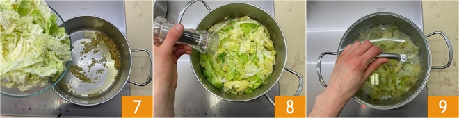 Once the shallot is sweated, add the savoy cabbage 7 to the pan and cook for about 5 minutes, salt 8 and pepper, pour a ladle of broth, cover with a lid 9, and continue cooking over low heat, adding more broth as needed, for about 10 minutes.
