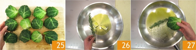 Repeat the same operation for the others 25. Pour the oil, butter, and a sprig of rosemary into a large pan 26. When the butter is completely melted, add the Savoy cabbage rolls 27.