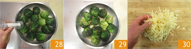 In the meantime, choose 12 large and intact Savoy cabbage leaves 16. Remove the fibrous central part if necessary, taking care not to break the leaf 17. Blanch the Savoy cabbage leaves in plenty of hot water 18 for about a minute.