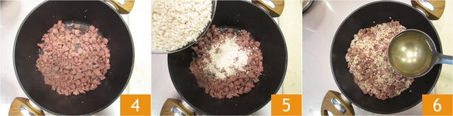and cook over high heat for about 3 minutes 4. Add the rice 15 and let it toast for a couple of minutes, stirring occasionally. Wet the rice with two or three ladles of hot broth 6 to cover it, and stir again.