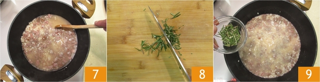 Cook the rice for about 25 minutes, continuing to add broth when necessary 7. Halfway through the cooking, chop 1 sprig of rosemary 8 and add it to the risotto 9.