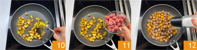 Add a splash of oil 10, toss in the sausage 11, and cook until golden brown for about 5 minutes, season with salt 12 and pepper. Let cool.