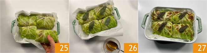 Place the rolls in a baking dish lined with parchment paper 25; top each with a sage leaf and drizzle the surface with the browned butter 26. Bake at 340°F (about 465°F) on the middle-upper shelf for about 10-15 minutes. The savoy cabbage rolls are ready to be enjoyed 27.