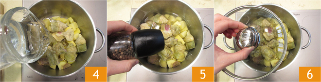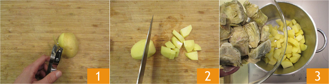 To prepare the scallops on artichoke cream and aromatic herbs, start with the cream: peel 1 and cut the potatoes into chunks about 3/4 inch 2, place them in a saucepan with the artichoke hearts 3.