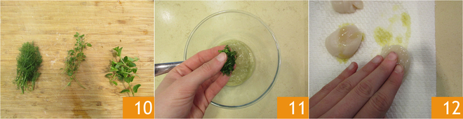Chop the aromatic herbs (marjoram, fennel, and mint) 10, keeping aside only a few whole marjoram leaves. When the artichoke and potato cream is lukewarm, add the chopped herbs 11 and mix well; adjust salt and pepper if necessary. Finally, take care of the scallops: wash and dry them well, carefully coat them with extra virgin olive oil 12.