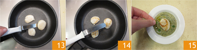 Heat a non-stick pan well, the base should be scorching: sear the scallops on both sides over high heat 13 14, in just a few moments, the scallops will brown. Compose the dish: pour two tablespoons of artichoke cream on each plate, place a scallop in the center, drizzle with a few drops of chili oil. Season with a sprinkle of freshly ground mixed peppercorns, two marjoram leaves 15, and a few flakes of salt on the scallop.